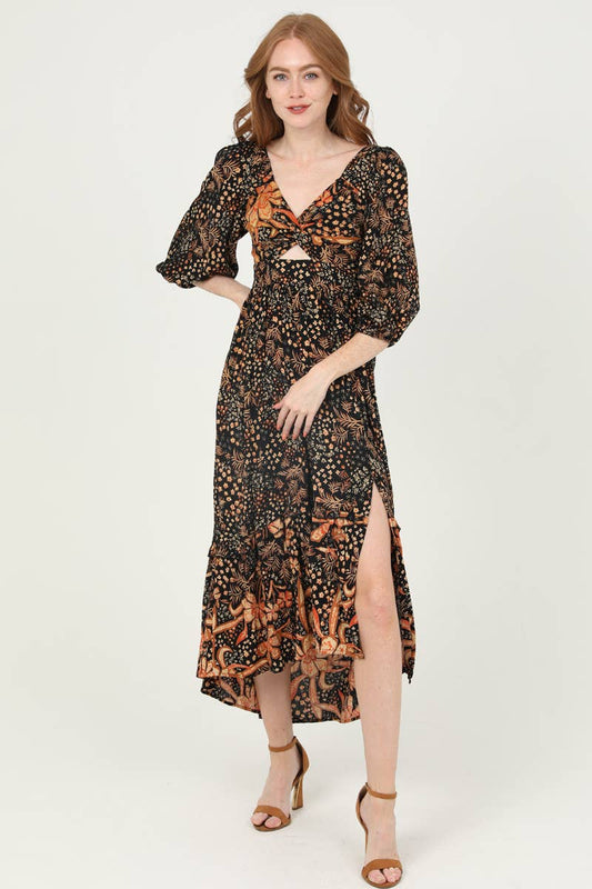 Boho Floral Print Black & Burnt Orange Twist Front Maxi Dress